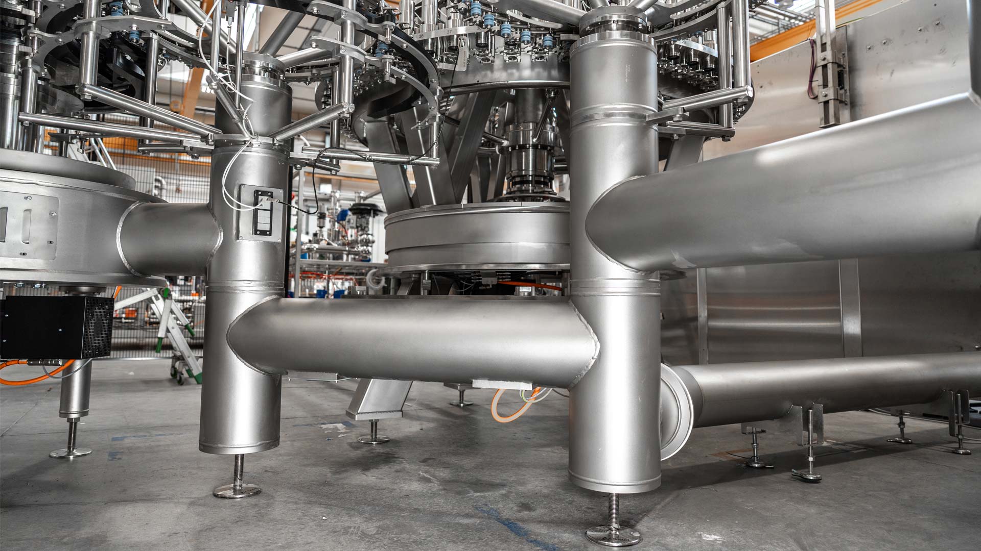 A EvoFILL PET apresenta um layout sem base que permite uma redução da área ocupada de até 15 % em comparação com os modelos anteriores. Esta configuração mais compacta melhora a integração da linha e liberta espaço valioso na sala de enchimento.